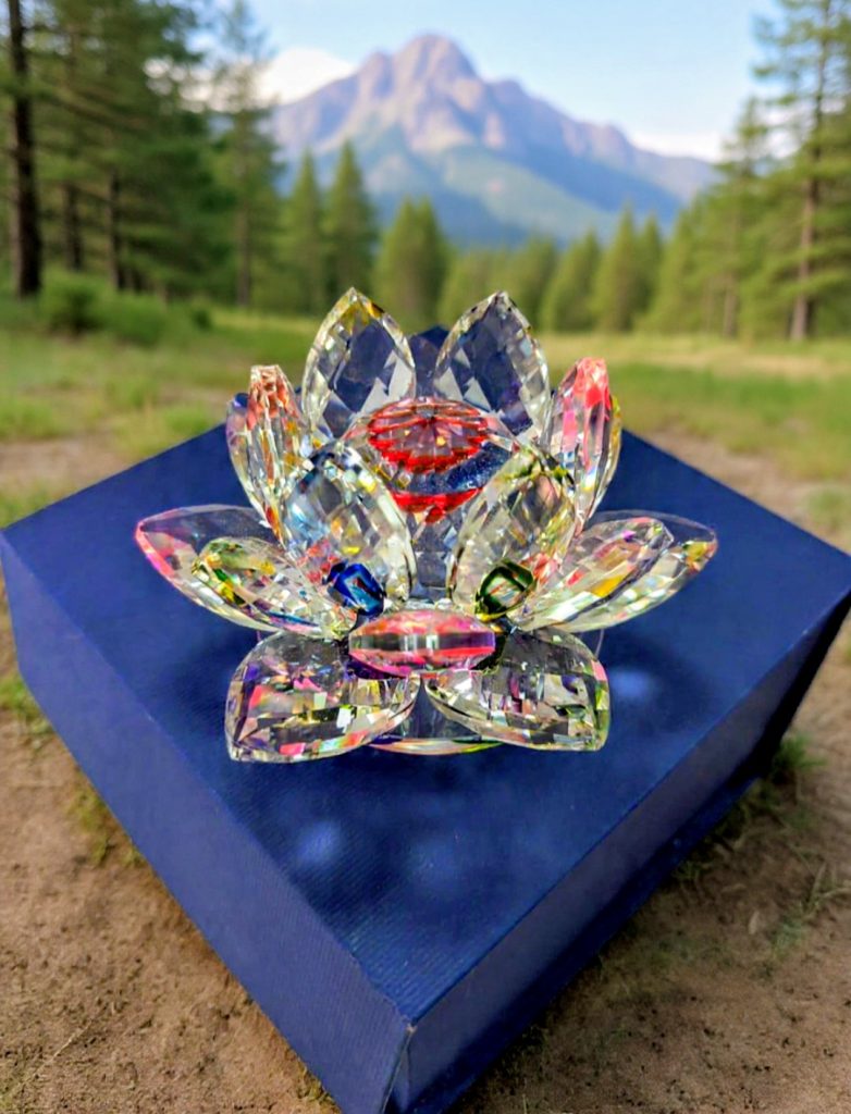 Hecho de cristal multifacético que refleja la luz en múltiples colores.