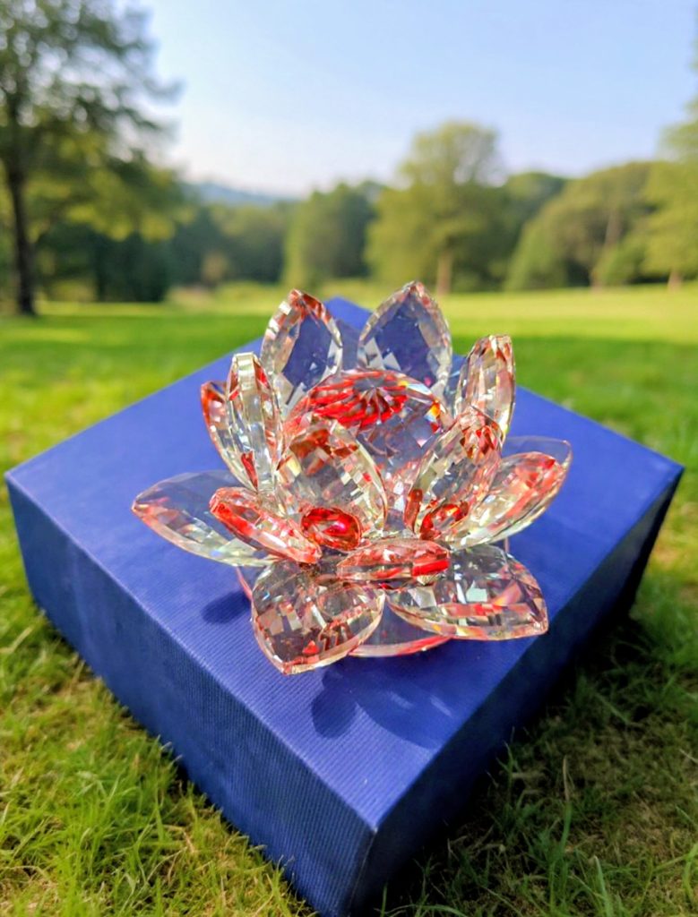 Hecho de cristal multifacético que refleja la luz en múltiples colores.
